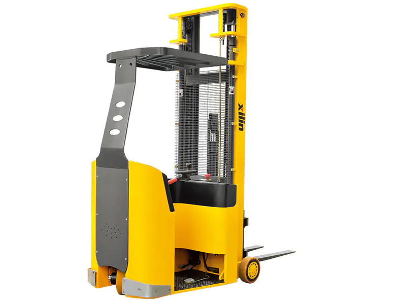 Drei-Wege-Stapler (Man-down): Der Fahrer befindet sich innerhalb der Fahrzeugkarosserie auf dem Boden und nur die Gabeln drehen und heben sich. Dieses Modell bietet eine hervorragende Kosteneffizienz für die Lagerung in schmalen Gängen auf niedriger bis mittlerer Ebene.