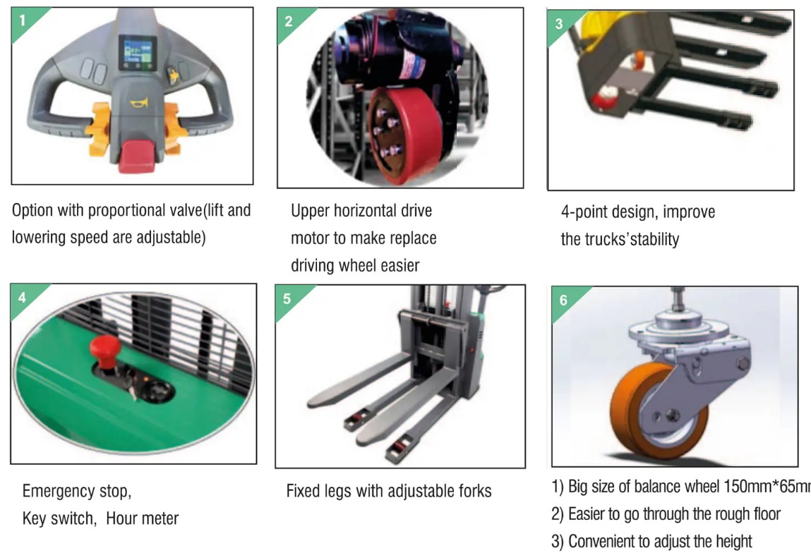 Dieses Design bietet elektrische Stapeler hervorragende Manövrierfähigkeit und einen engen Drehradius, was sie ideal für das Umgang mit Kurzstrecken und das Stapeln in schmalen Gängen, überfüllten Produktionshallen oder kleineren Lagerhäusern. Die Ladung wird normalerweise zwischen den Vorderausfällen und den Rädern geteilt, sodass sie strukturell unfähig sind, wie Gabelstapler "schwebende" Vorgänge zu "schweben".